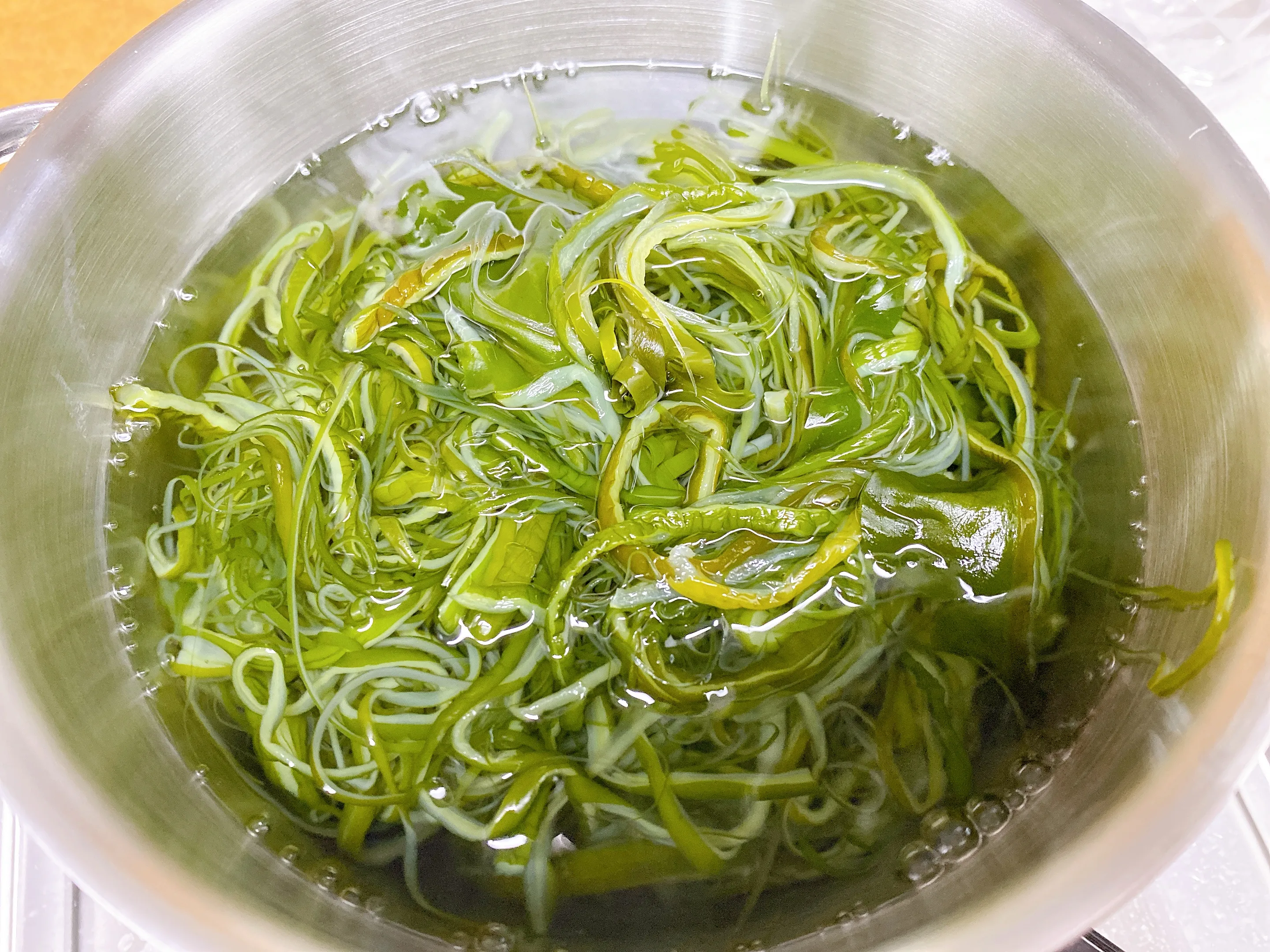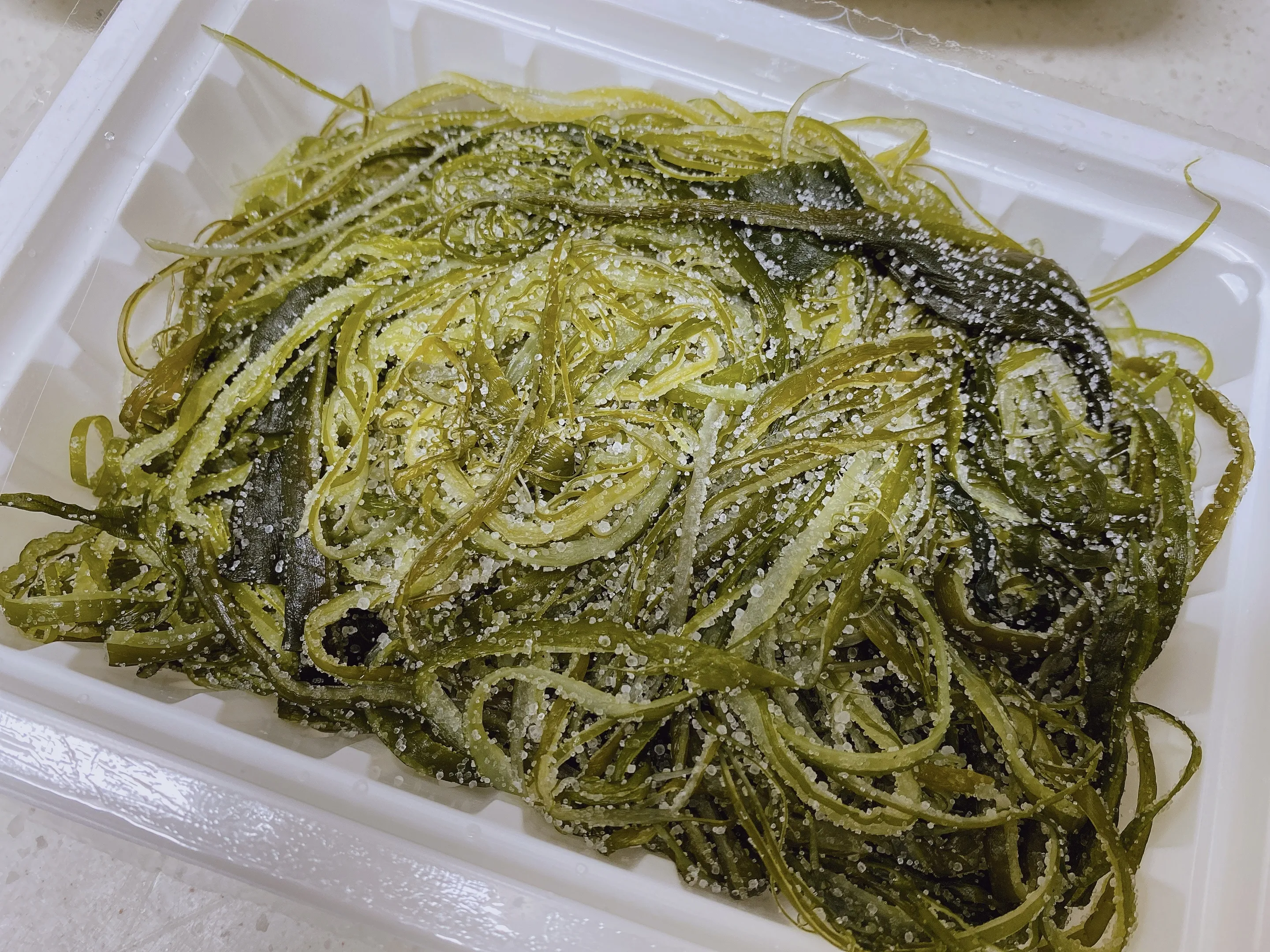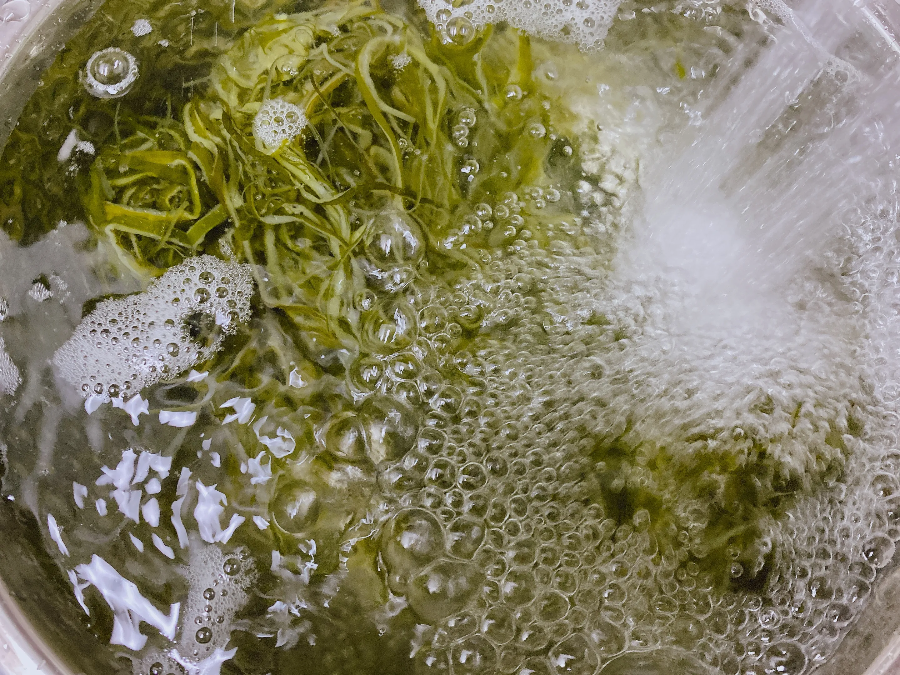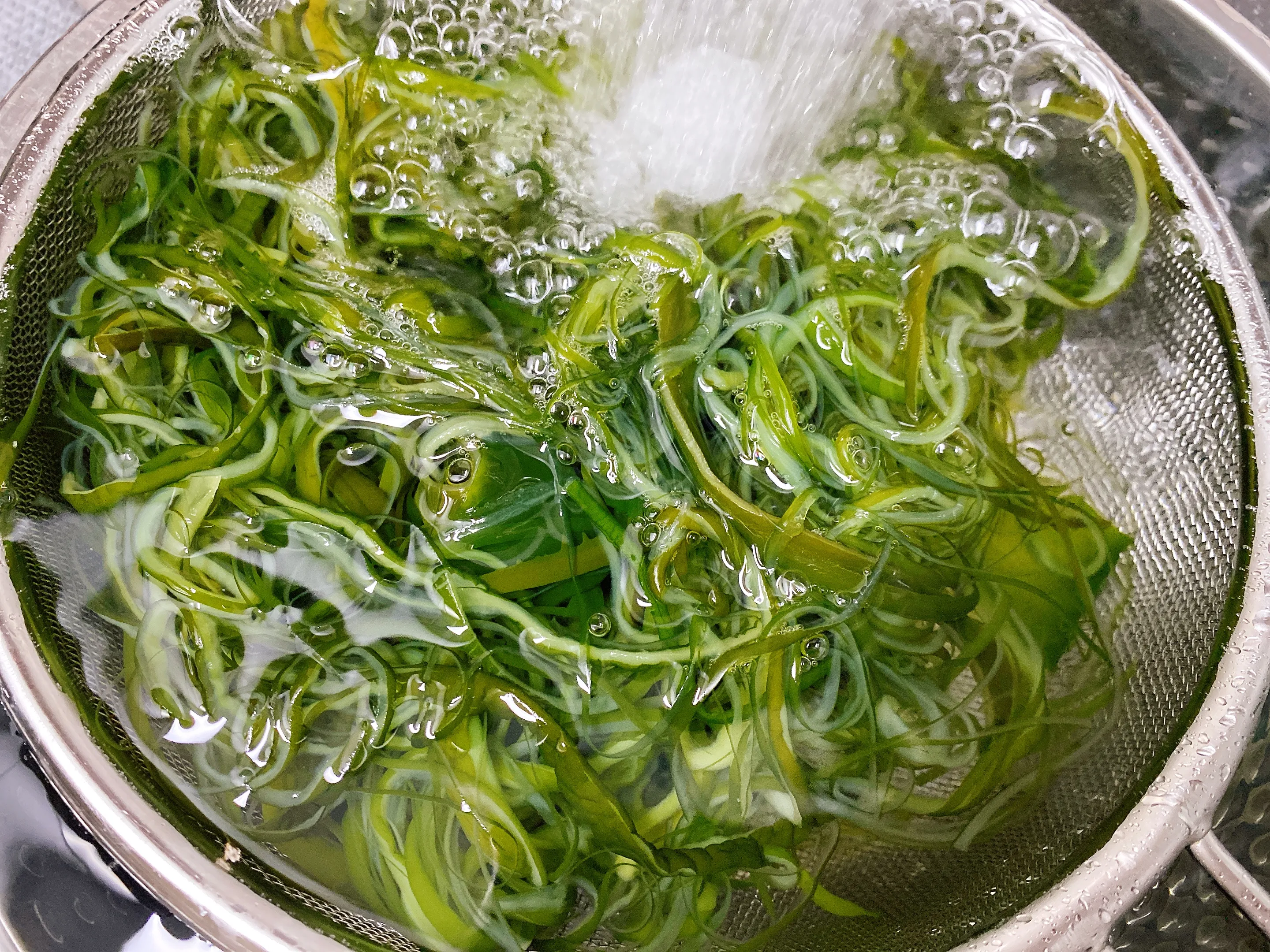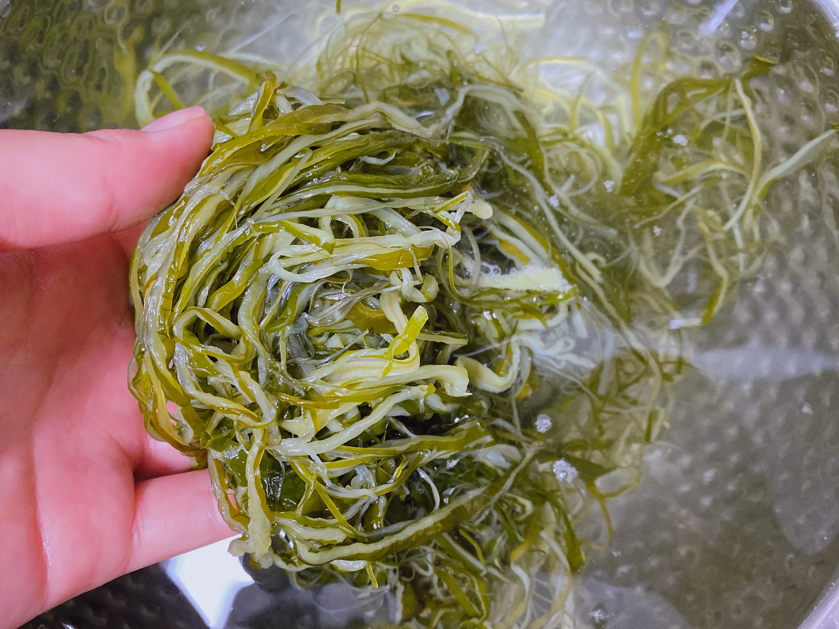 마트에서 사온 염장 미역줄기를 꺼내 물을 잠기도록 부어줍니다. 뭉쳐진 미역들을 살살 풀어주면서 씻어내면 아래 가라앉은 소금을 확인할 수 있습니다. 이 과정을 몇 번 더 해주면 소금이 거의 나오지 않게 됩니다.