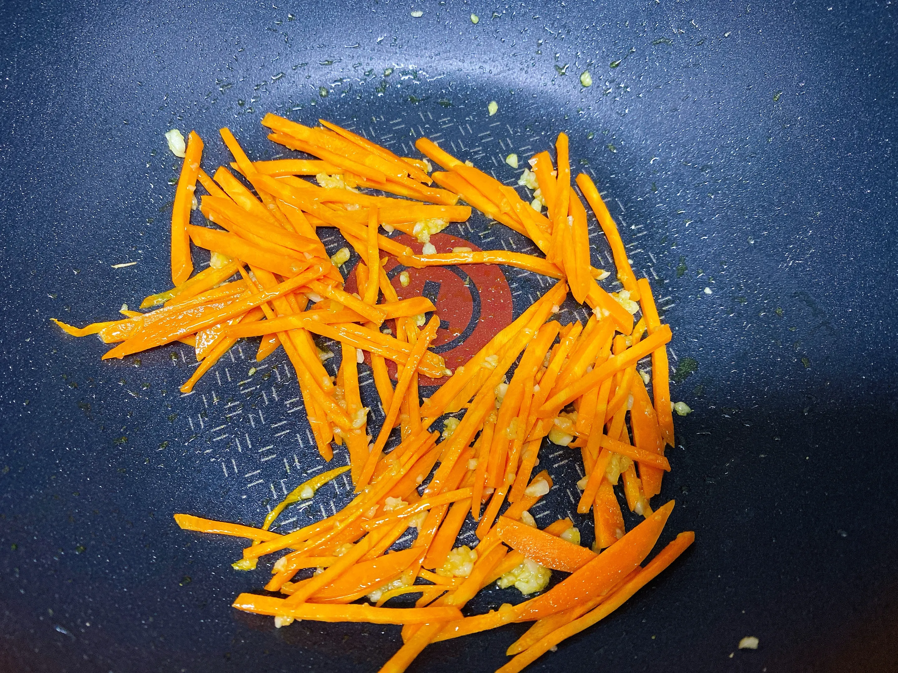 프라이팬에 기름을 두른 후 마늘 한 큰 술을 넣고 볶아줍니다. 마늘향이 올라오면 당근과 양파를 차례로 넣고 살짝 볶다가 미역줄기를 넣어서 함께 볶아줍니다.