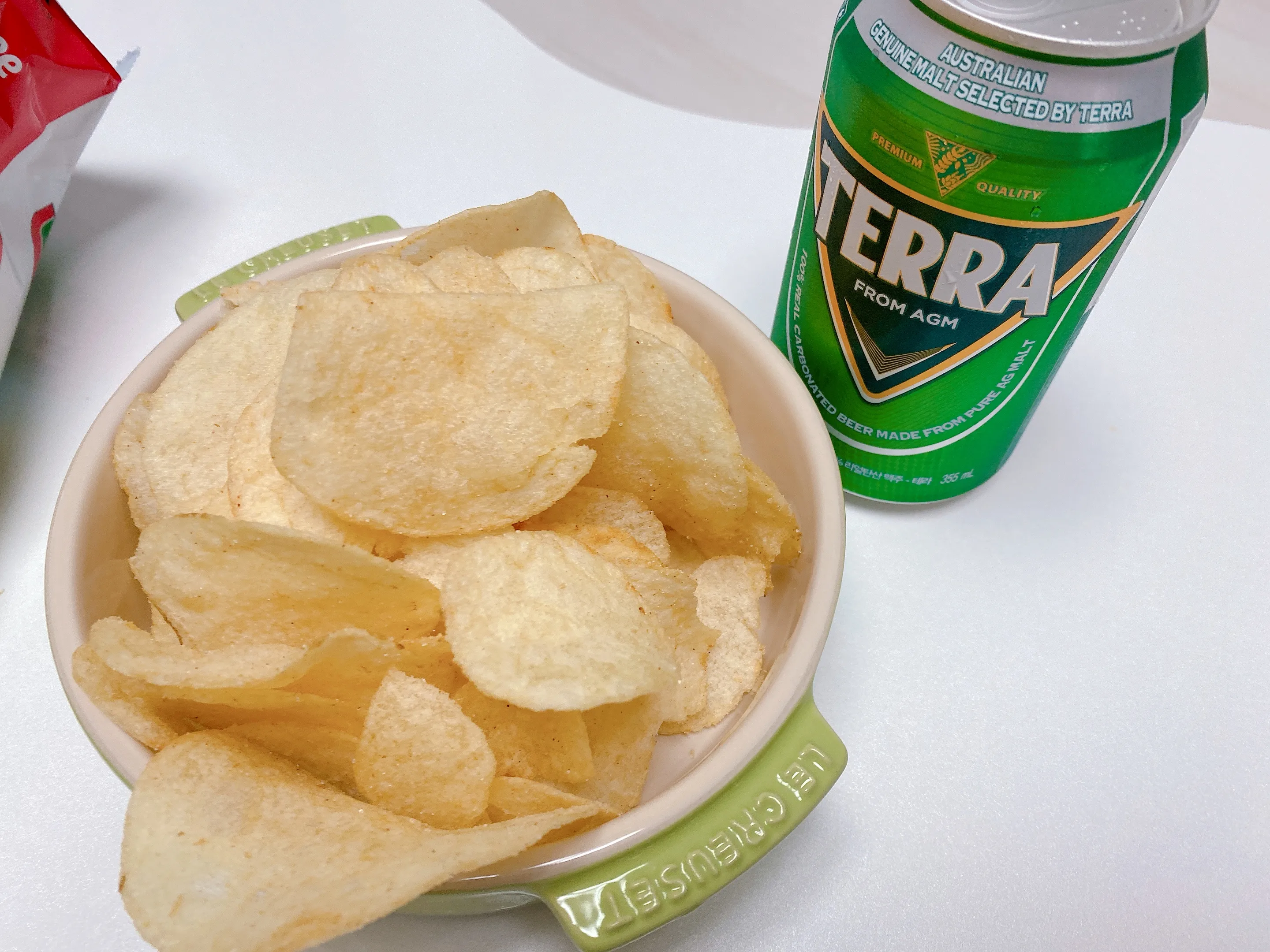 감자칩을 먹을 때 빠질 수 없는 것은 바로 맥주! 맥주랑함께 먹으려고 테라 한 캔을 꺼냈답니다. 개인적으로 해태 고향만두칩이 홈술족을 겨냥한 콜라보 제품이었다면 고기만두 시즈닝 맛이 더 강했으면 좋았겠다는 아쉬움이 들었습니다. 일반 감자칩도 아닌 것이 고기만두도 살짝 나는 것이 뭔가 애매했답니다. (고향만두칩 김치만두맛도 있던데 그래도 혹시나 하는 마음을 품고 김치만두맛에도 도전해봐야겠습니다.) 본 제품은 해태와 CU에서 콜라보한 제품이기 때문에 편의점 CU에서 만날 수 있습니다. 😋