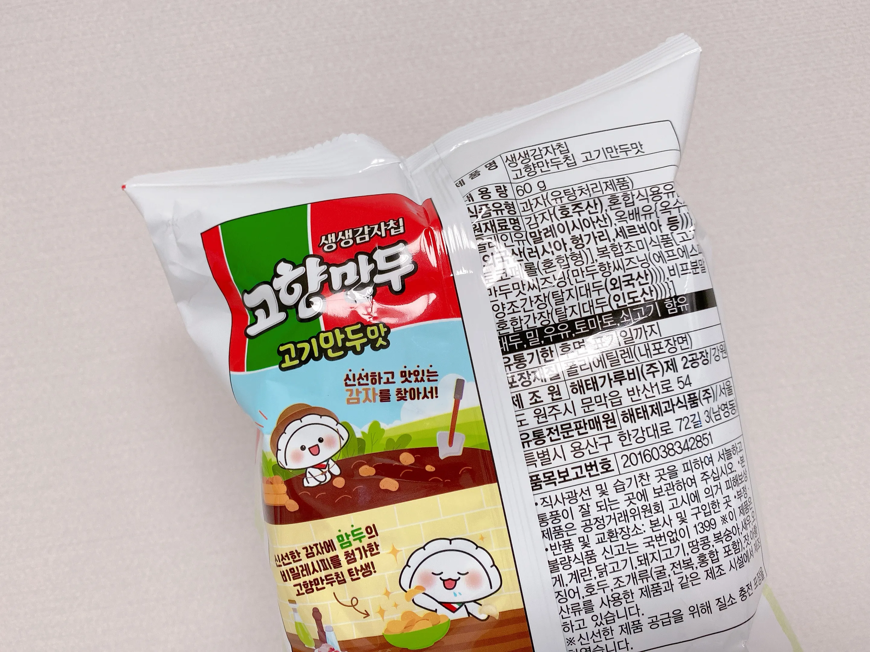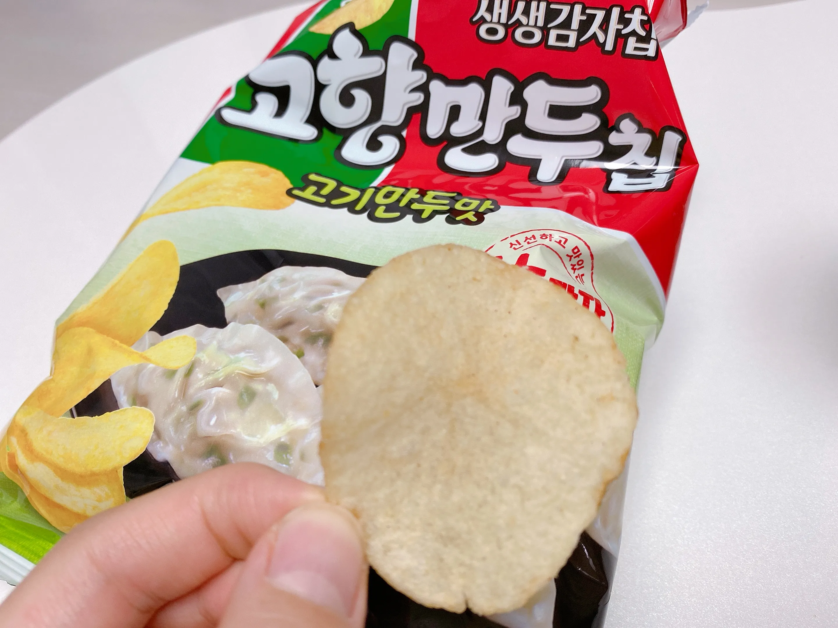 패키징을 딱 보자마자 이건 완전 고향만두인데?라는 생각이 들었답니다. 일반 감자칩과 같은 크기의 봉지과자이고, 실제 들어있는 감자칩의 모양도 비슷했습니다. (칼로리는 60g 기준 350kca)
