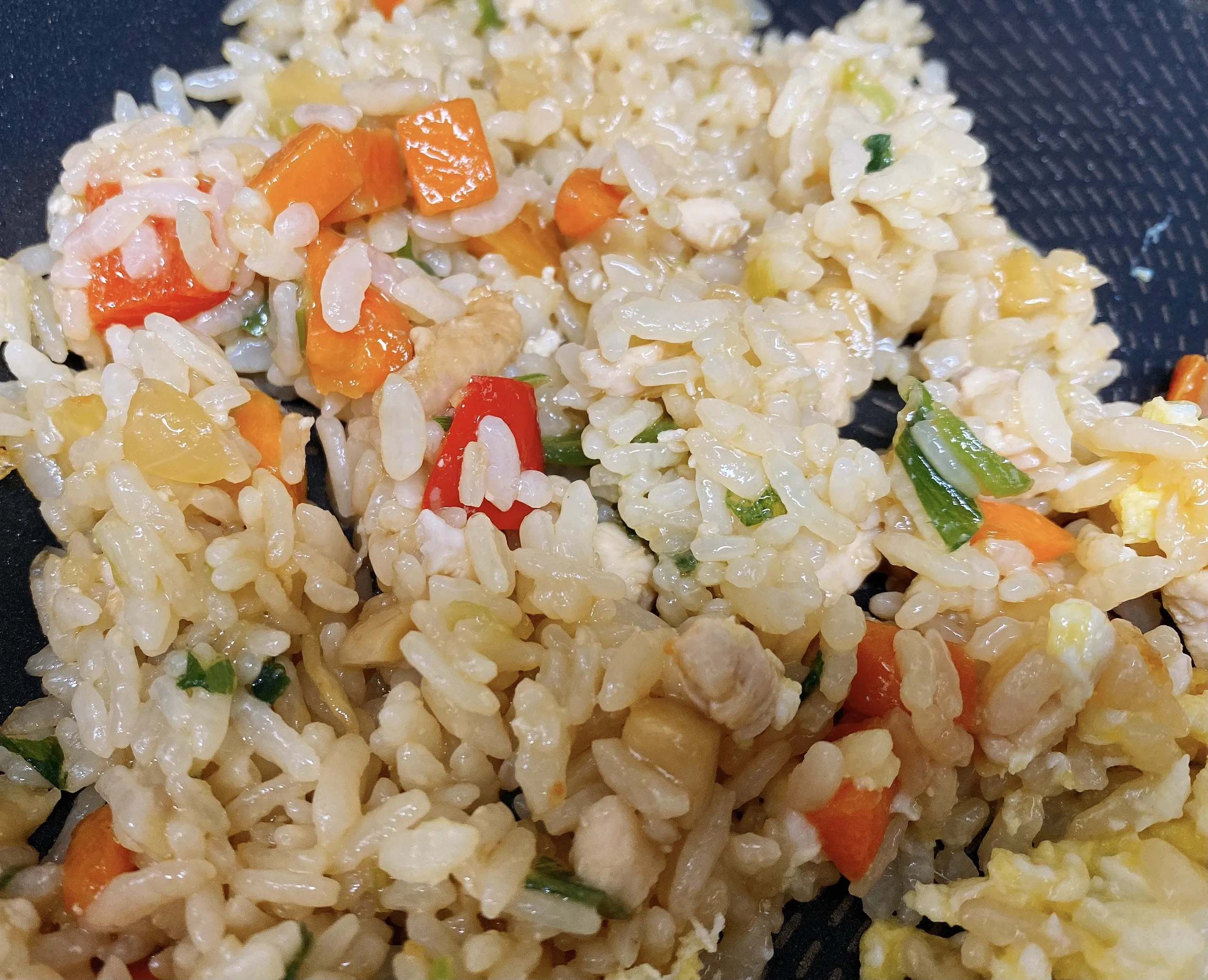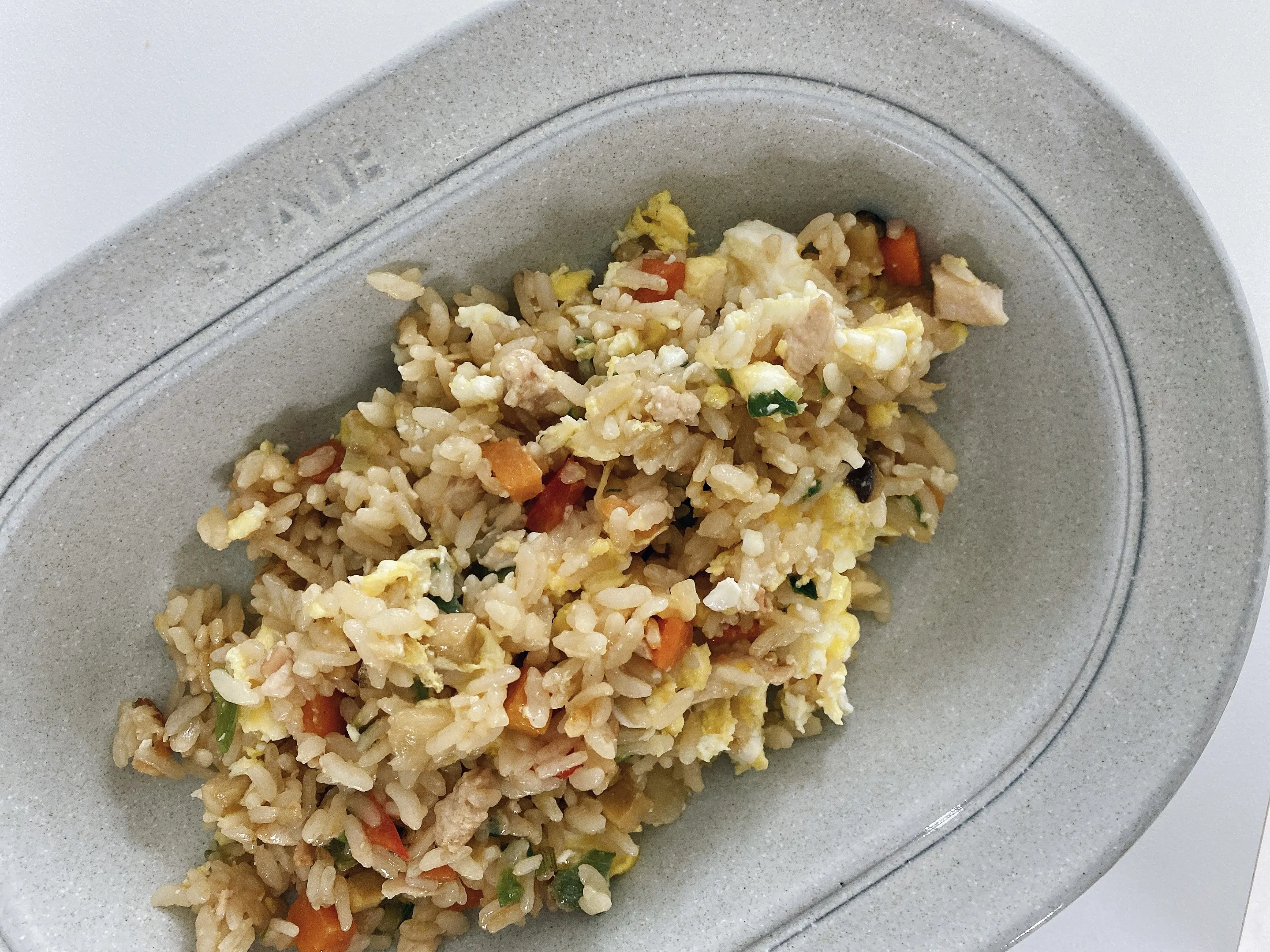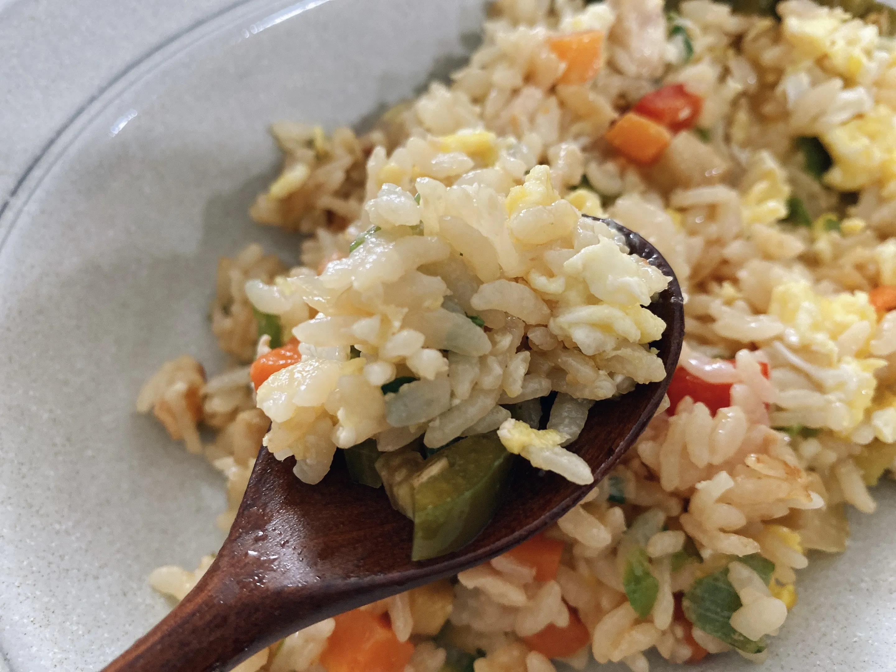 나무주걱으로 잘 섞어주면서 약 3분가량 볶고 나니 촤르르 윤기가 나는 볶음밥이 완성되었습니다. 당근, 피방, 닭고기 건더기가 꽤 먹음직스러워 보입니다. 밥의 양이 많지 않은 것 같아 계란도 하나 꺼내 스크램블 해준 뒤 밥과 함께 섞어줬습니다.