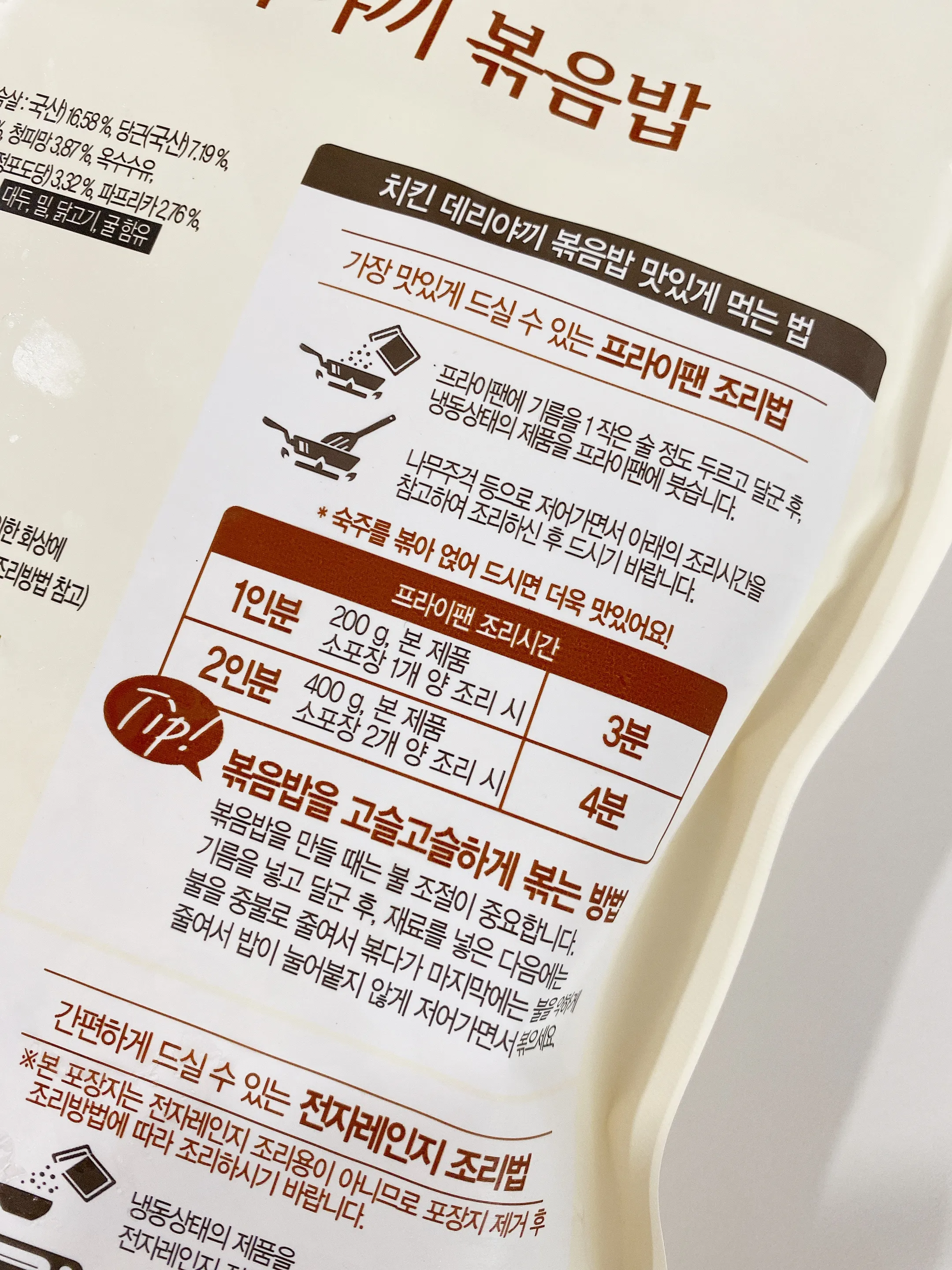 큰 봉지를 뜯으면 총 2개로 소분 포장되어 있었고 봉지 뒷편에 조리법이 자세히 적혀있었습니다. 프라이팬을 활용한 조리법과 전자레인지 조리법 2가지가 있었지만 개인적으로 전자레인지에 조리를 할 경우 고슬고슬한 맛은 좀 떨어지는 것 같아 후라이팬을 이용했습니다. (하지만 아침 출근길에 바쁠 때는 전자레인지를 애용한답니다.😂)
