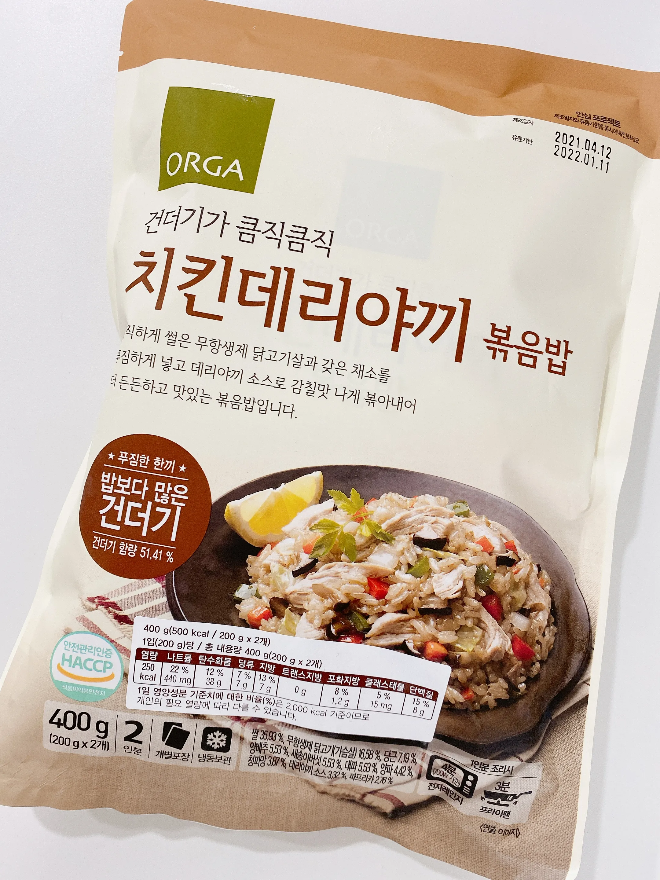 올가 브랜드는 풀무원의 친환경식품 전문 브랜드로 유기농 식품 등을 주로 판매하고 있는 브랜드입니다. 그래서 그런지 볶음밥 패키징에도 무항생제 닭고기살이 들어있다고 적혀있었습니다. 한 봉지에 열량은 250kcal로 생각보다는 높지 않았습니다.