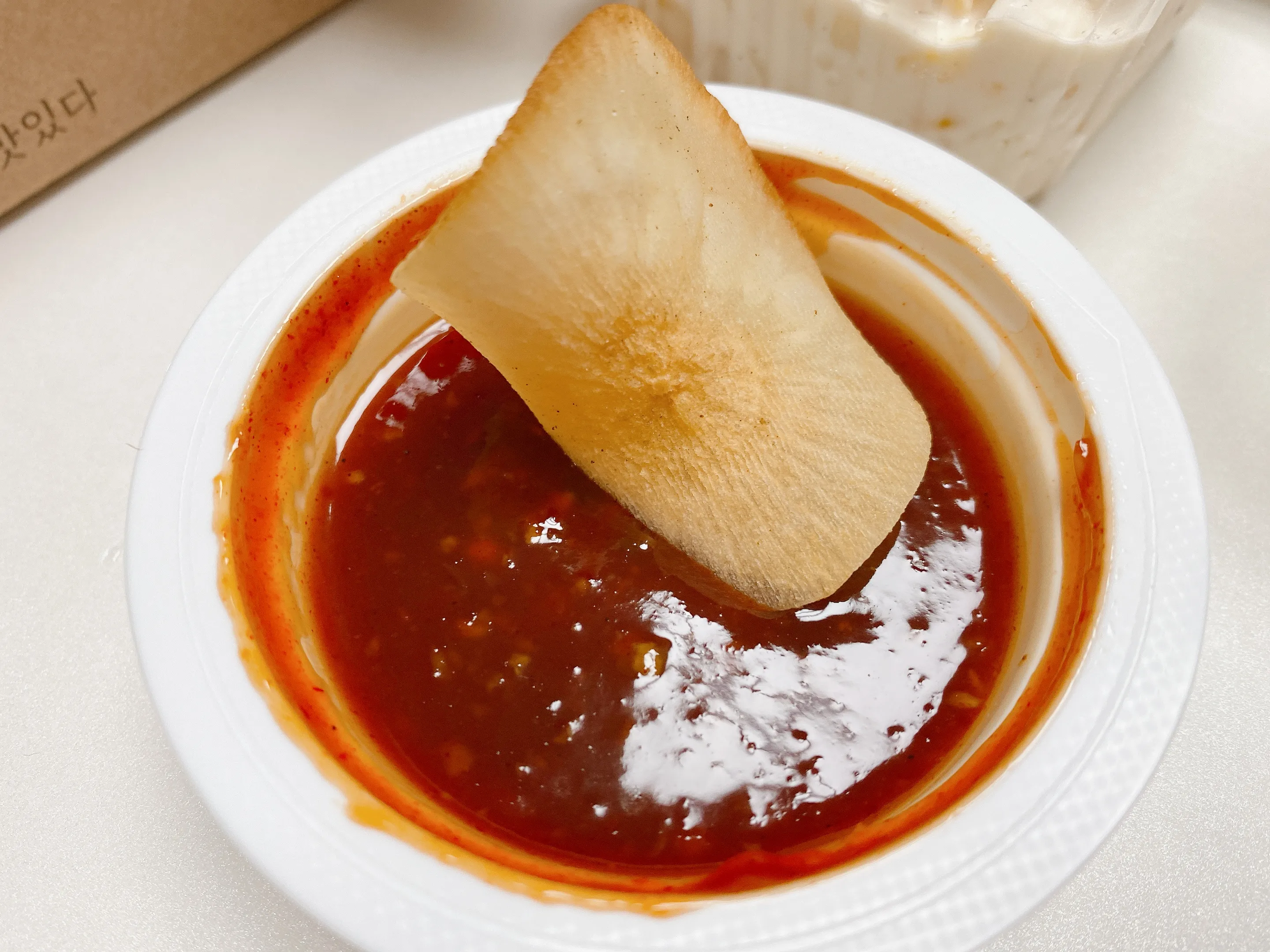 역시 대세치킨답게 새우가 정말 통통하고 크기도 크더라고요. 함께 온 카사바칩은 치킨 위에 뿌려먹어도 되지만 저는 따로 동봉된 소스에 찍어 먹었습니다. 대새치킨 레드는 생각보다 맵지 않아서 다음 번에는 대새핫블랙을 먹어봐야하나 싶습니다.