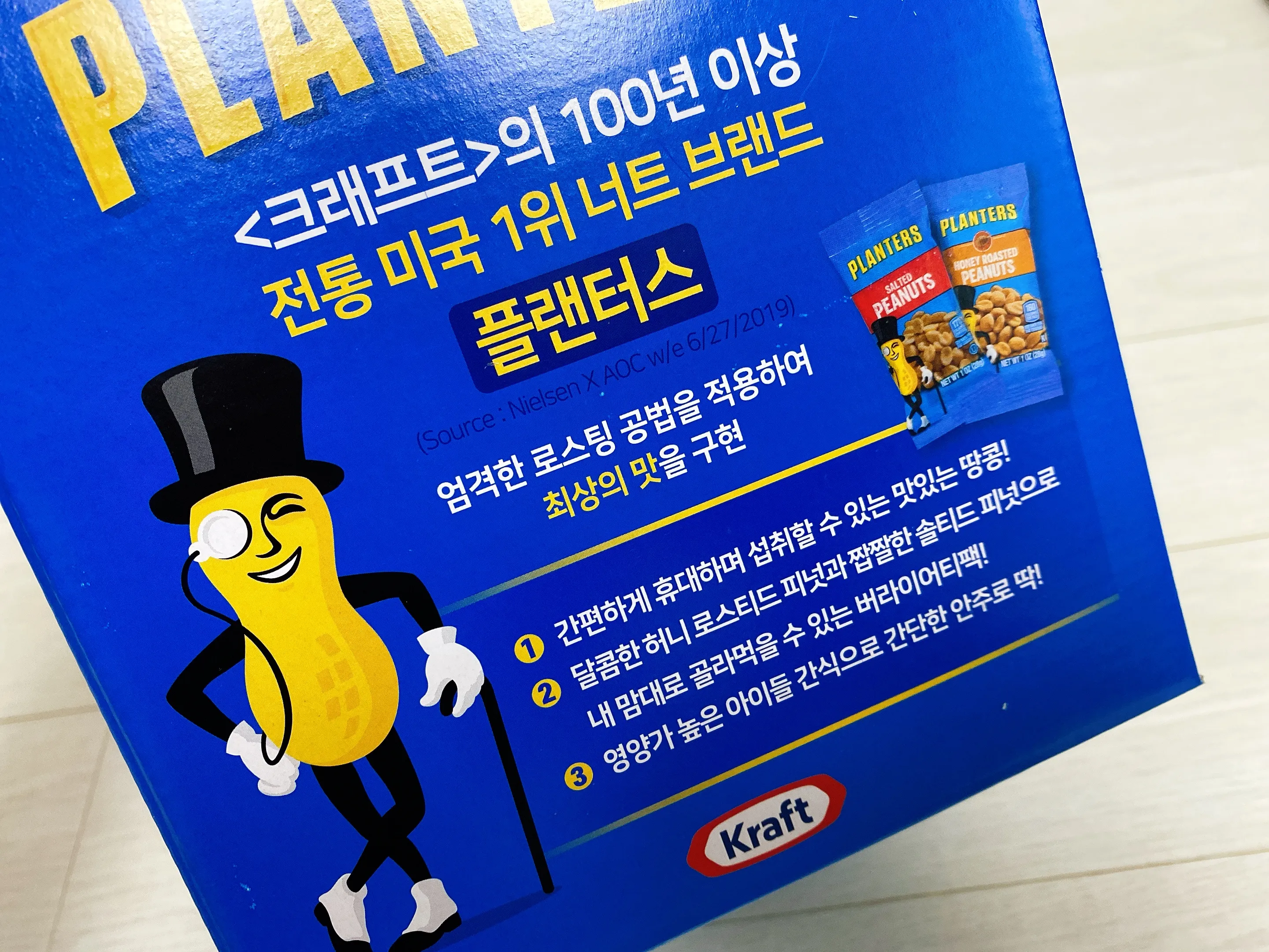 플랜터스 피넛은 100년 이상 미국에서 1위를 한 너트 브랜드라고 하는데요. 코스트코에서 구매한 플랜터스 피넛 박스는 앞쪽을 뜯으면 이렇게 언제든지 꺼내먹을 수 있도록 되어있어 선반 위에 올려놓기에 딱 좋더라고요.