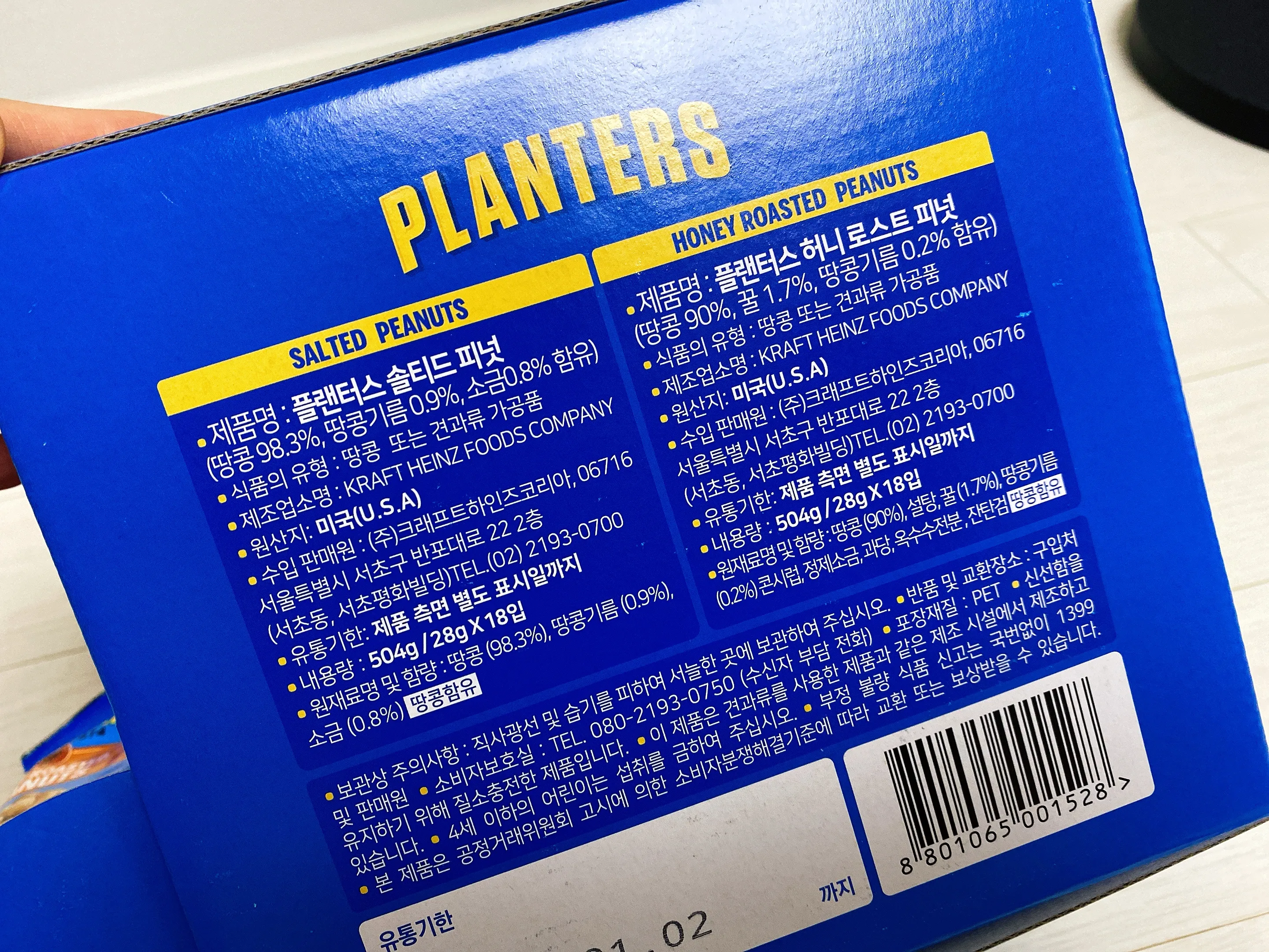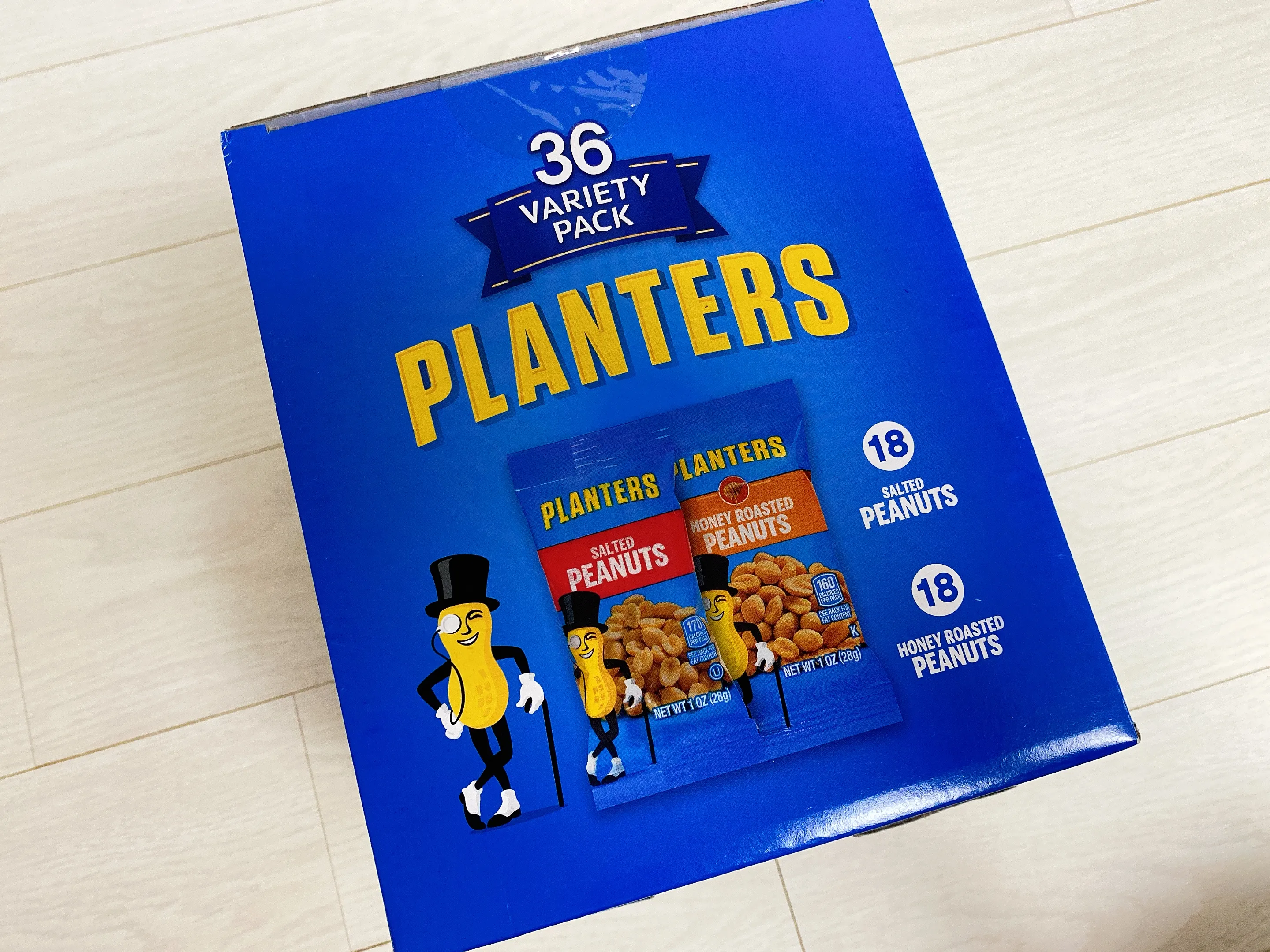 코스트코에서 구매한 플랜터스 피넛은 솔티드 피넛 18개와 허니로스티드 피넛 18개 총 36개입이 들어있답니다. 한 봉지는 약 28g으로 가방 속에 쏙 휴대해서 다니기도 참 괜찮은 사이즈랍니다.