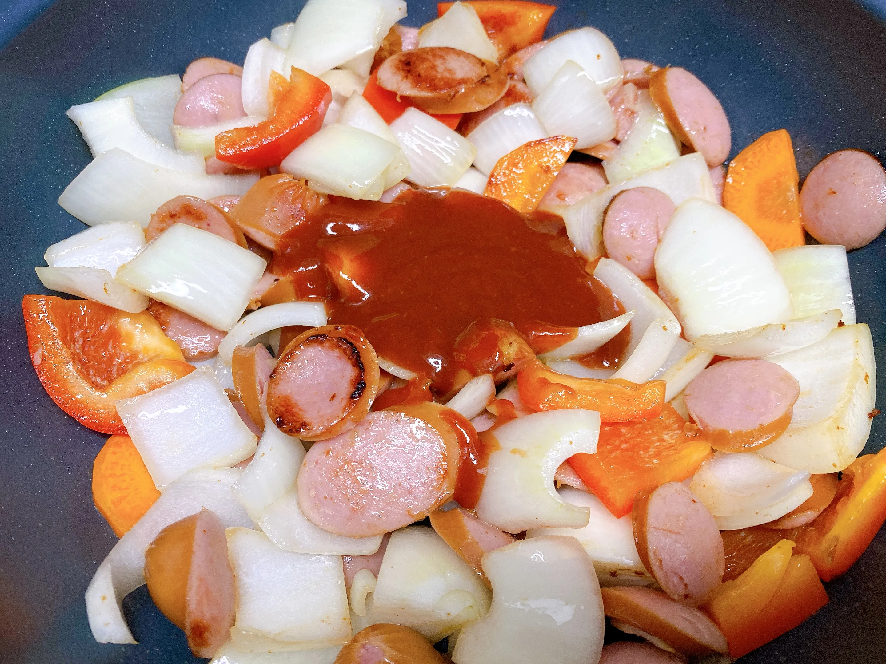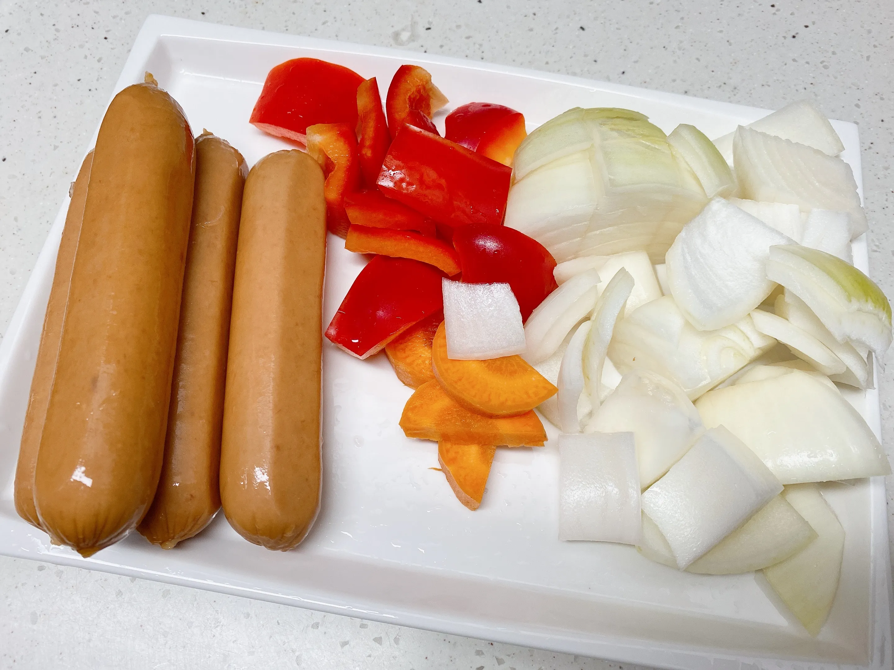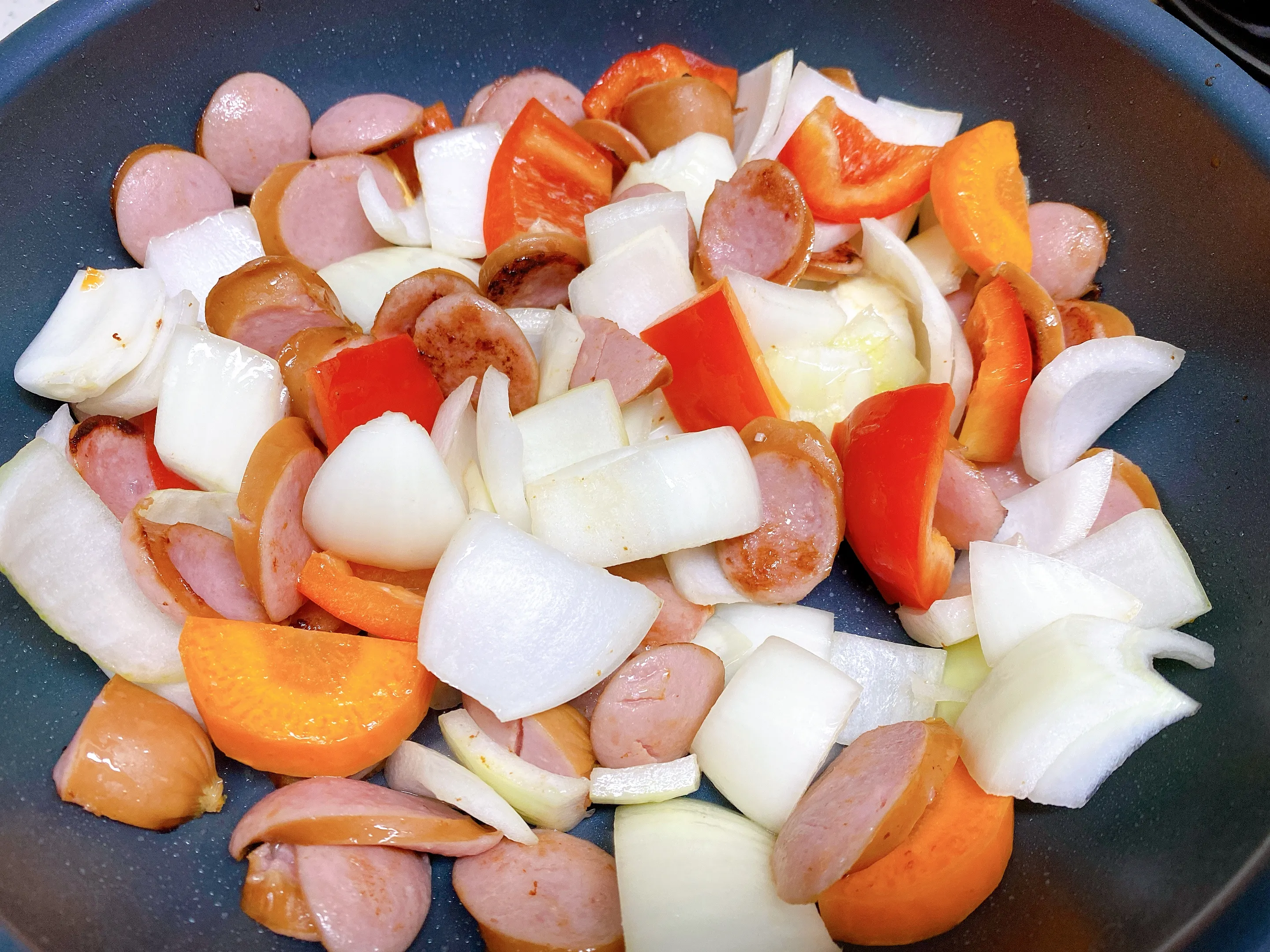3. 식용유를 두르고 소세지를 볶아준 후 소세지가 익었을 때 양파, 파프리카 등 채소를 넣어주세요. 마늘이 있다면 통마늘을 소세지와 함께 볶아주면 더 맛있게 즐길 수 있습니다.