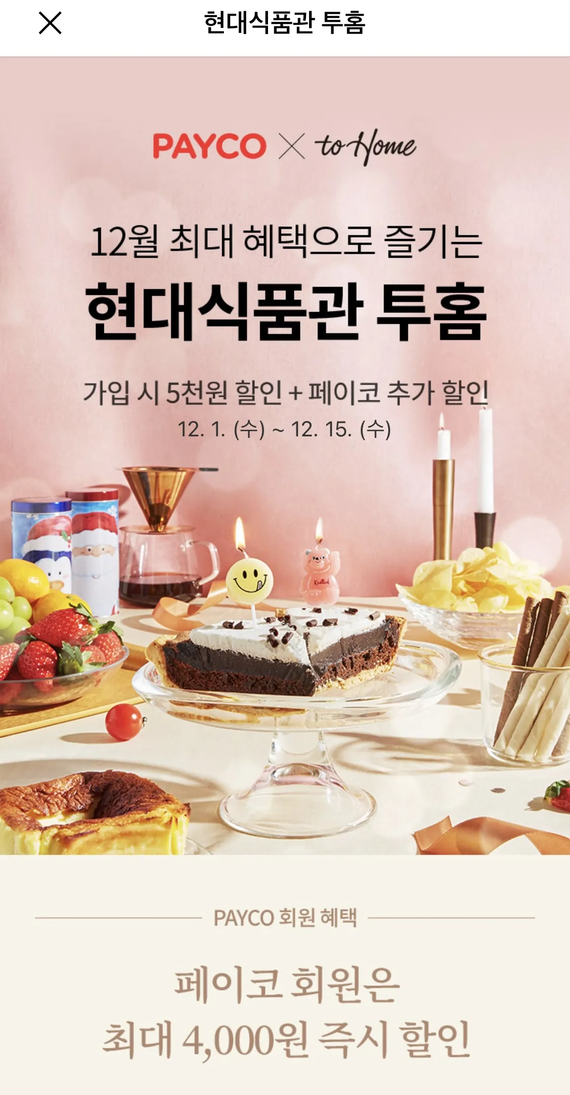 구매에 앞서 부랴부랴 투홈 앱을 설치하고 신규가입을 했답니다. 이때 페이코를 통해 가입하는 경우 페이코 할인쿠폰 사용은 물론 신규회원 전용 쿠폰을 발급 받을 수 있답니다. (신규회원 혜택 덕분에 다용도 보관용기 6pcs 짜리를 6,400원에 할인해서 겟!) 페이코 앱을 실행한 후 검색창에 현대백화점 투홈을 검색하니 혜택을 바로 확인할 수 있었어요. 혹시 가입 전이시라면 혜택을 받고 주문해보세요.