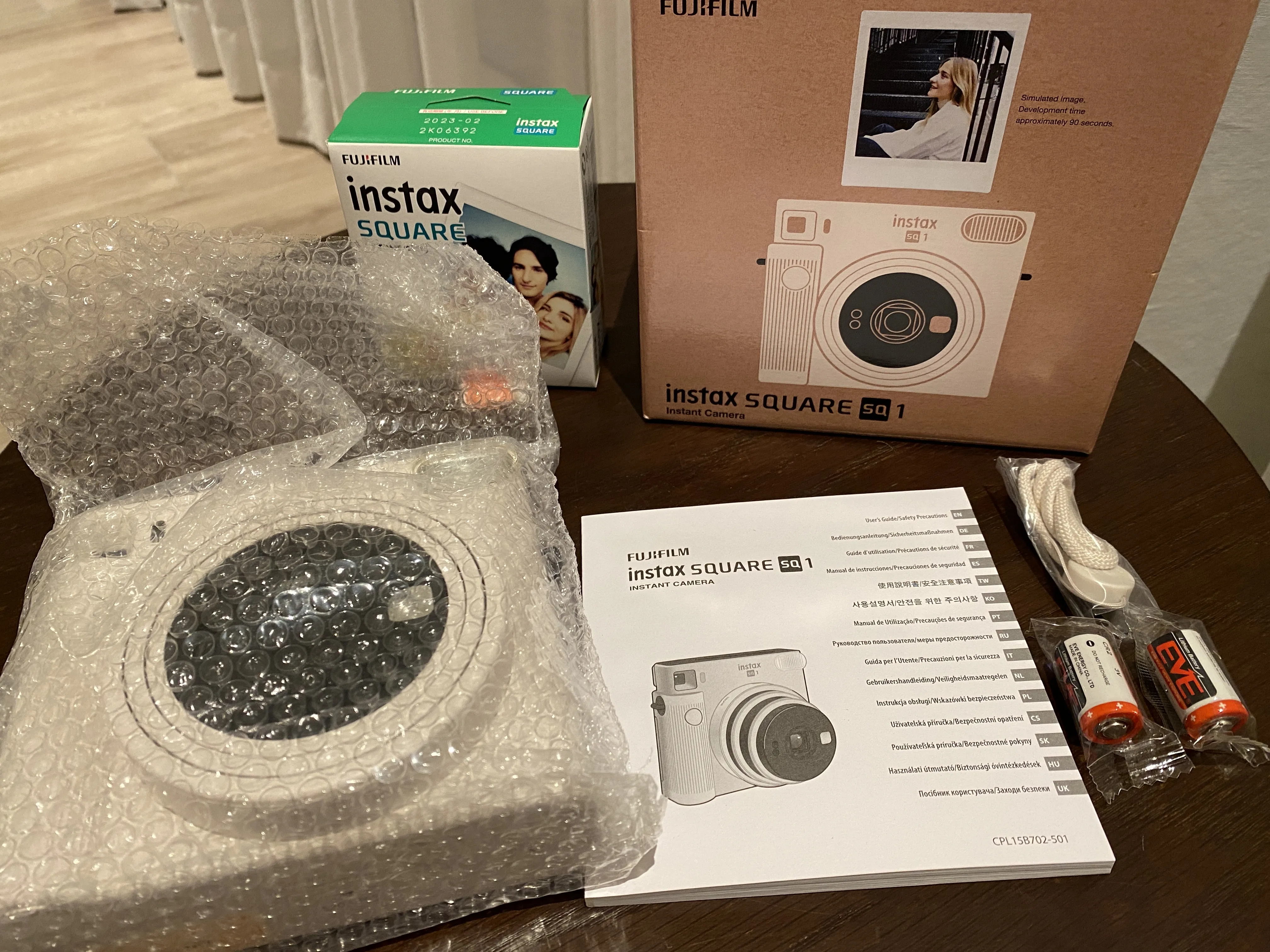 가장 떨리는 순간은 역시 언박싱의 순간이죠. 숙소에 도착하자마자 조심스럽게 필름과 폴라로이드 카메라를 개봉했답니다. 건전지와 설명서, 그리고 떨어뜨림을 방지할 수 있는 손목스트랩 이렇게 담겨있었는데요.
