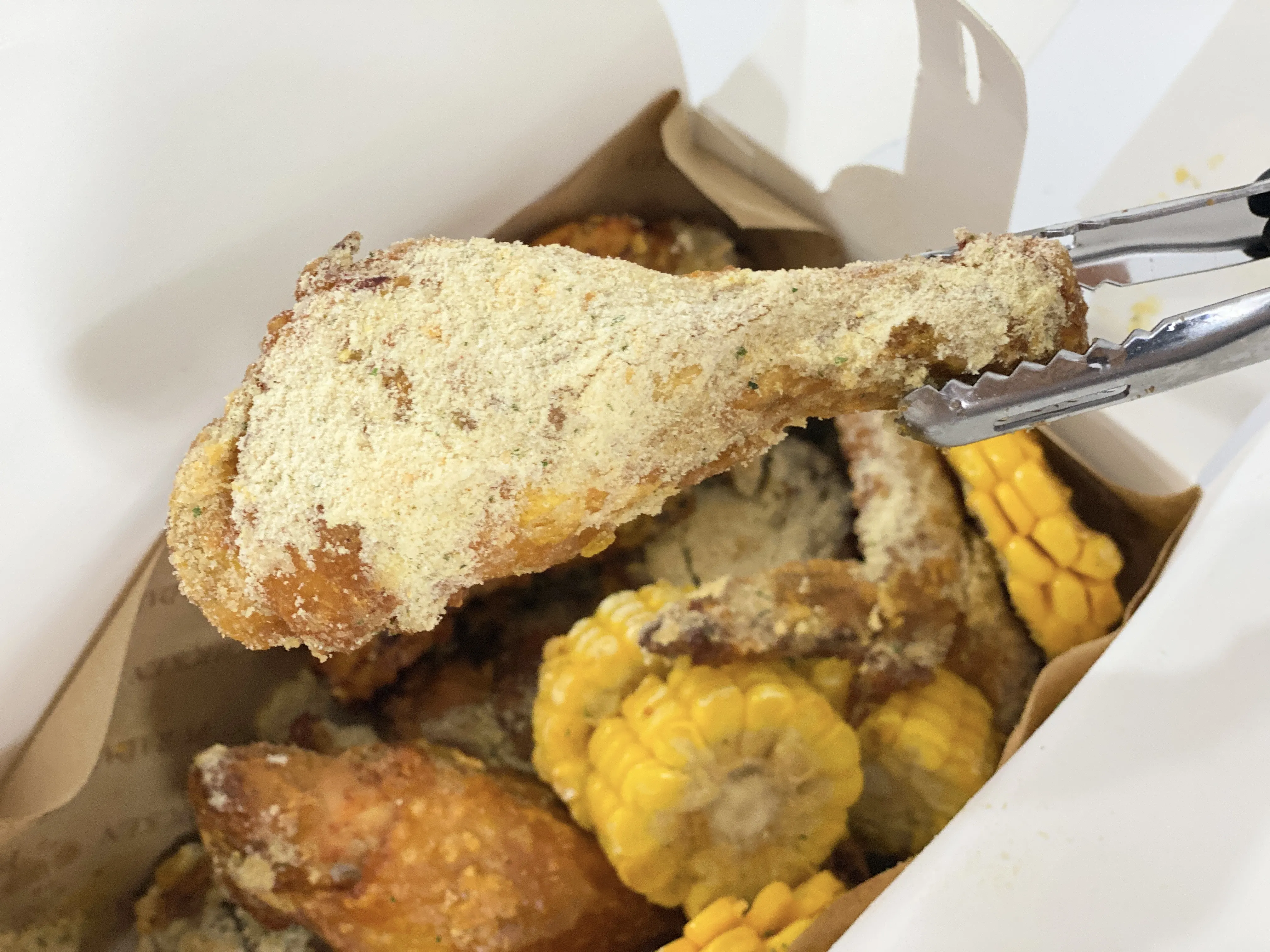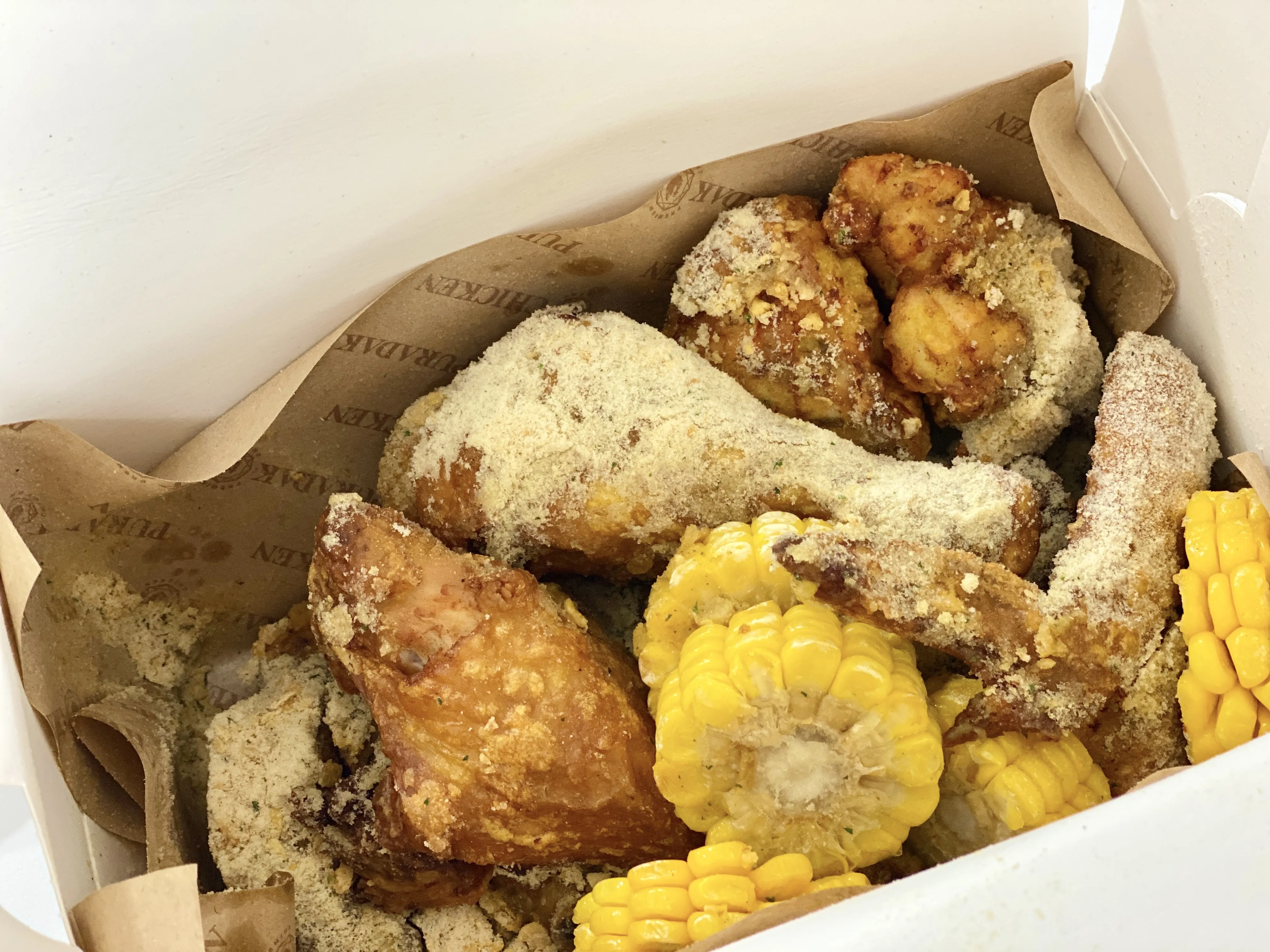 눈처럼 소복하게 쌓인 콘 시즈닝!! 조금 식은 다음에 먹었더니 시즈닝이 녹아 붙어서 다소 아쉽긴 했어요. 역시 시즈닝 치킨은 배달이 오자마자 바로 먹어야하는 것 같아요. 단짠단짠한 맛에 맥주랑 정말 잘 어울리는 메뉴였답니다. 오븐에 구운 후라이드 치킨이라 그런지 담백하기도 하고요. 😊