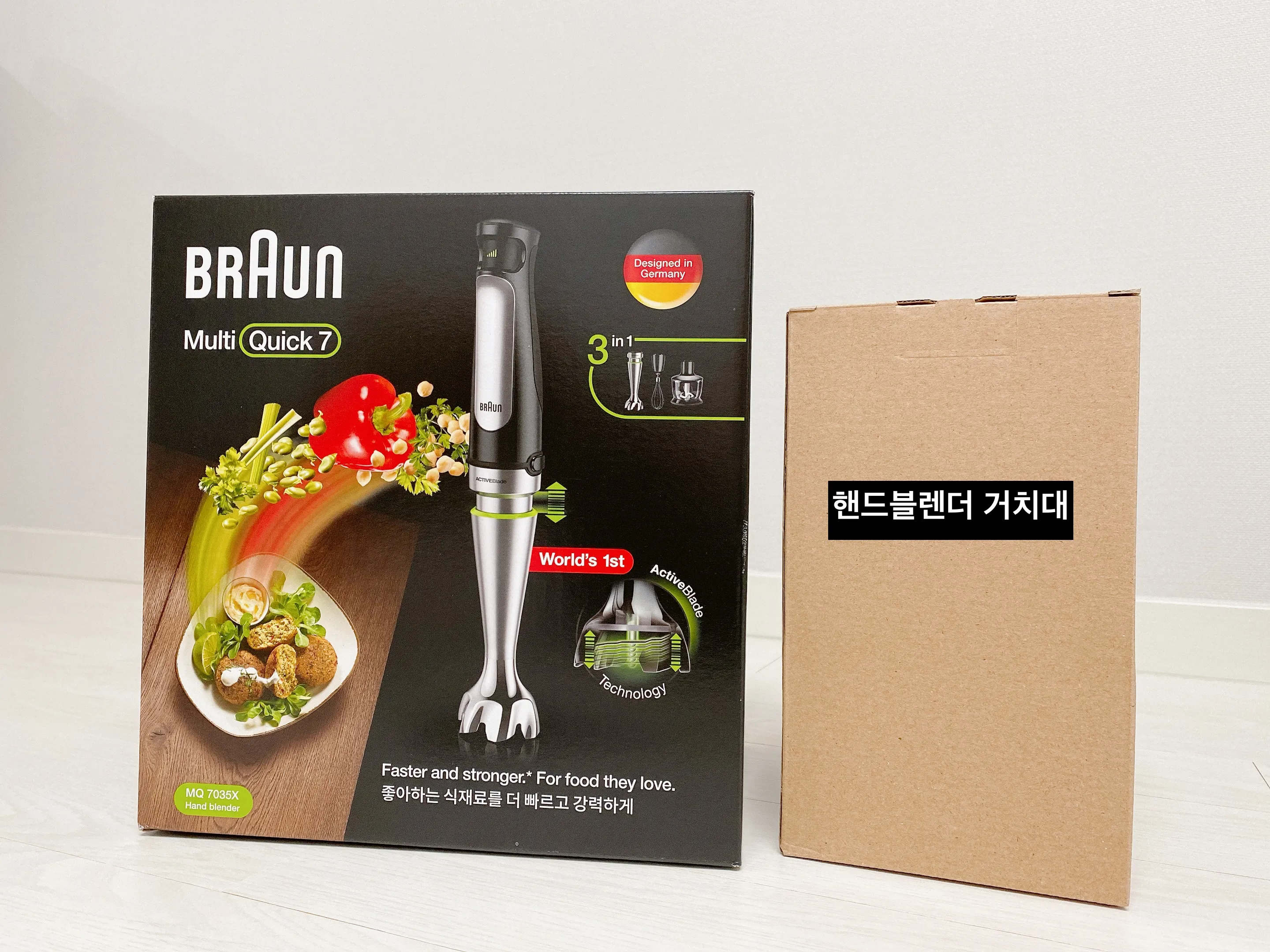브라운 핸드블렌더 MQ7035X 제품을 구매할 때 보니 특별 에디션으로 거치대를 함께 제공하는 패키지가 있더라고요. 핸드블렌더를 싱크대에 꺼내 놓고 사용할 예정이라 거치대가 포함된 제품으로 구매했어요. 거치대 포함 에디션이 조금 더 가격이 비쌌던 것으로 기억합니다.