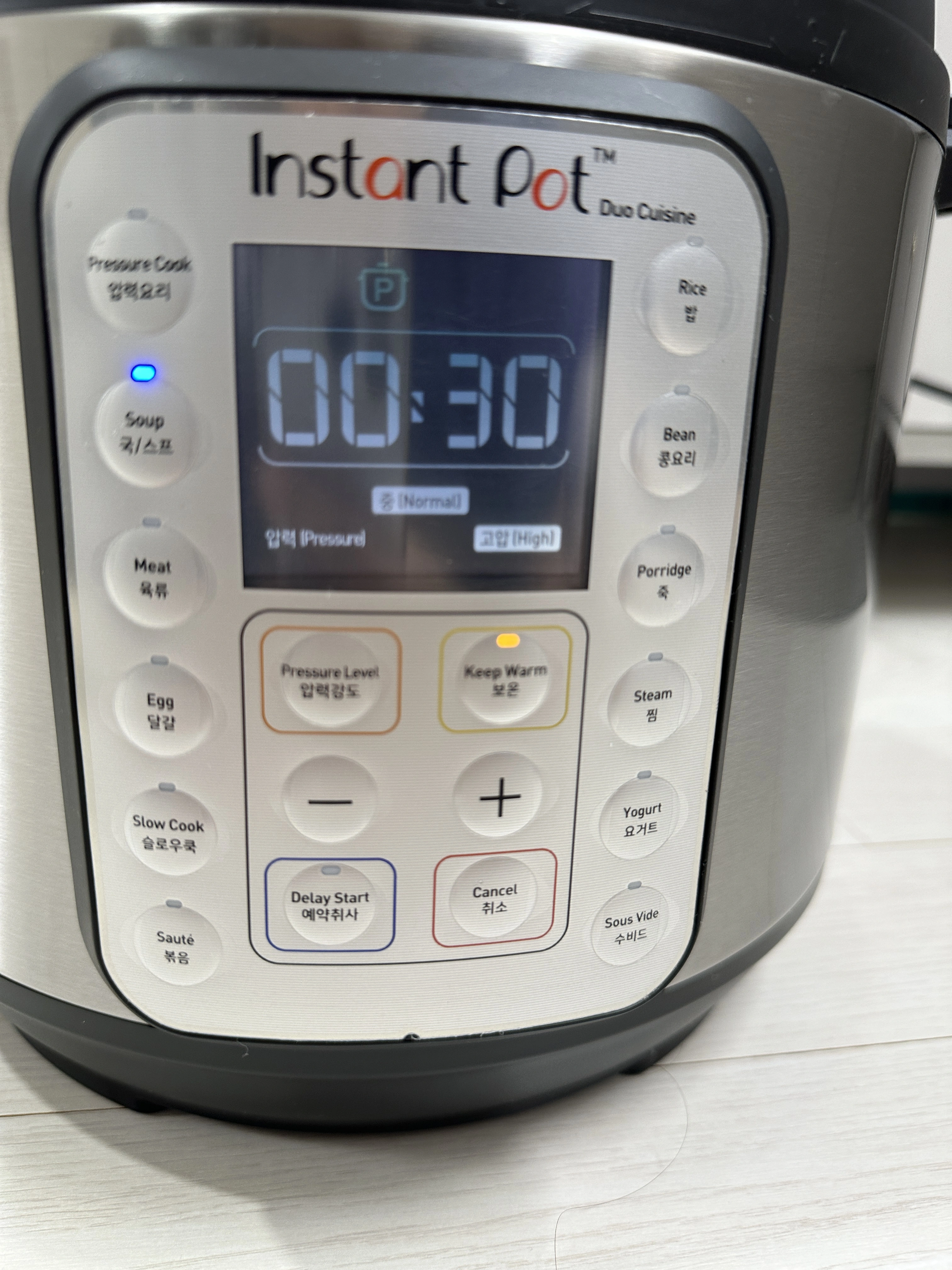 인스턴트팟 특성상 예열 시간이 필요하기 때문에 조리가 완료되기까지 세팅한 시간보다 조금 더 길게 소요된다는 점을 꼭 기억해주세요. 또한, 조리가 완료된 뒤에는 자연스럽게 압력이 빠지는 시간을 기다리거나 벨브를 눌러 압력을 빼주세요.