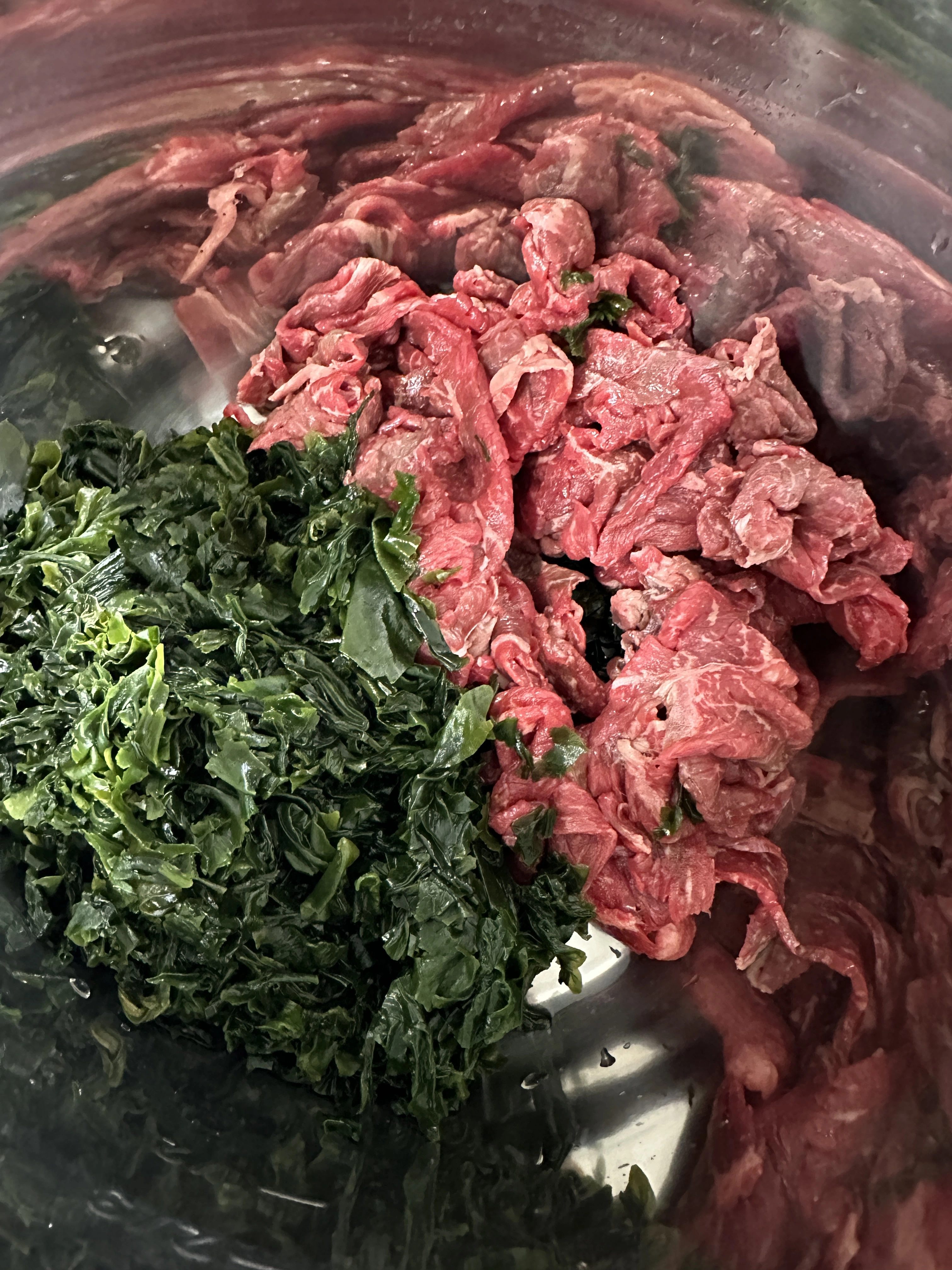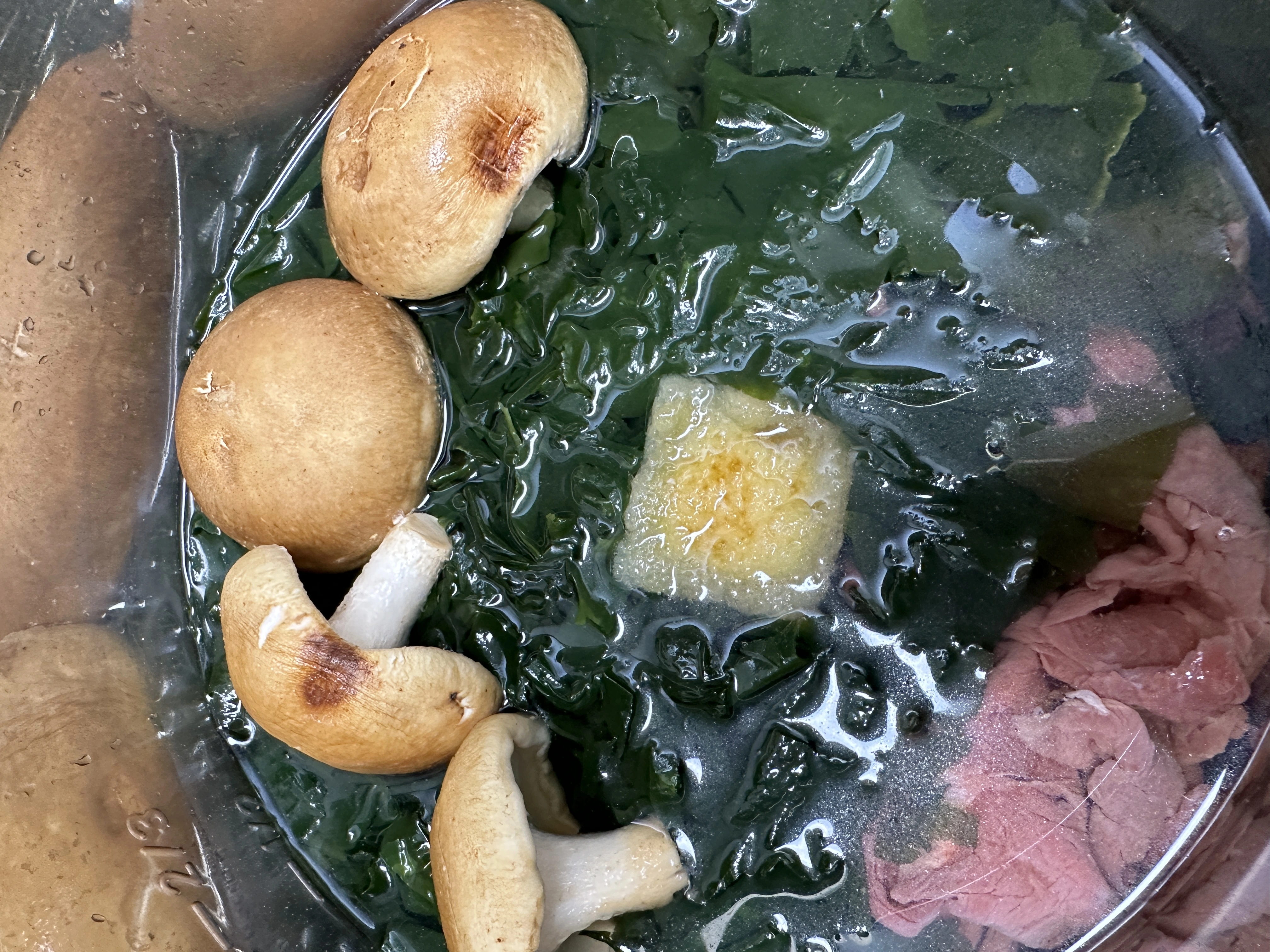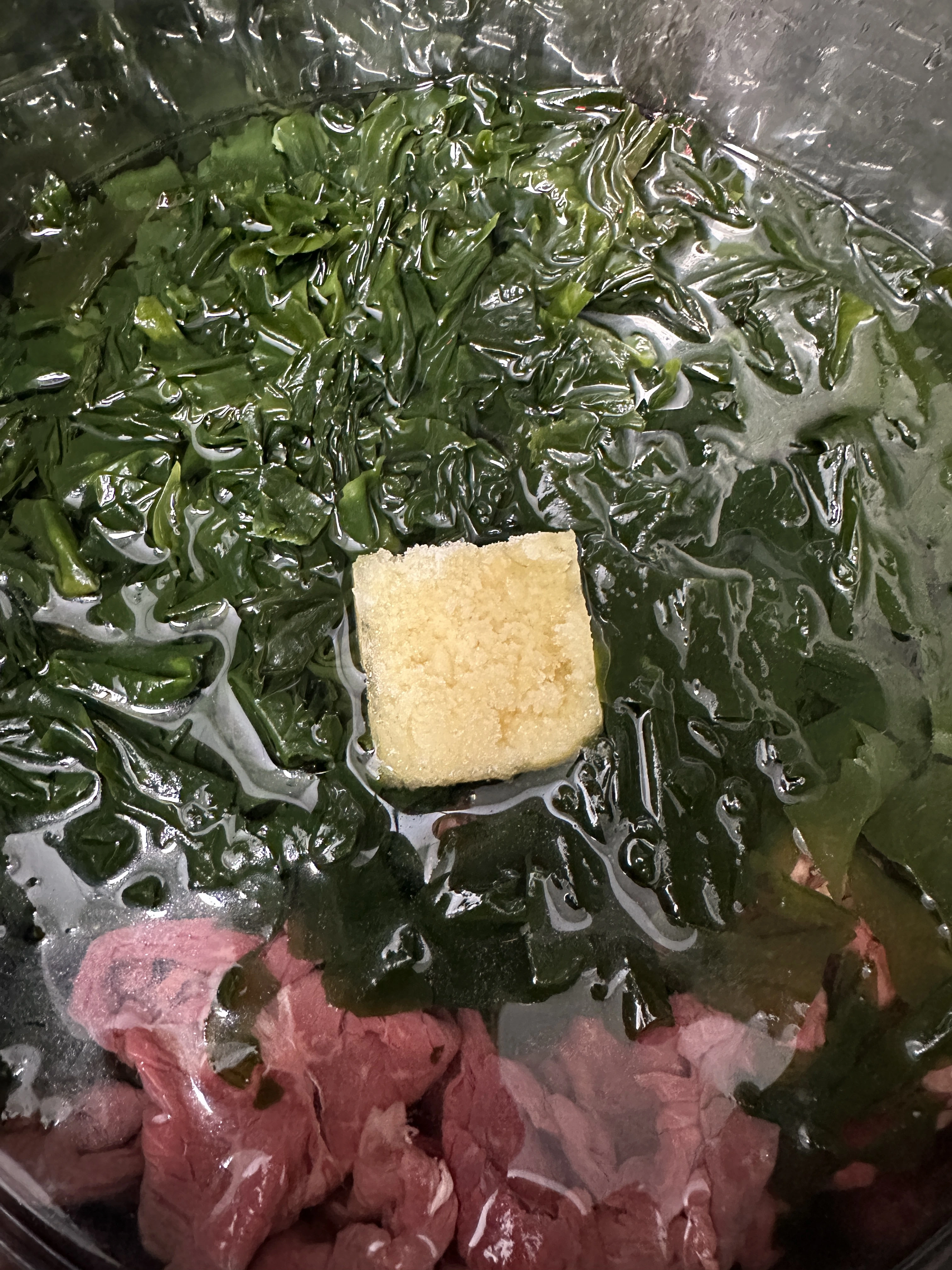 인스턴트팟에 준비한 물 2리터, 미역, 소고기, 다진 마늘 1스푼, 국간장 2스푼, 참치액 2스푼을 넣어줍니다.