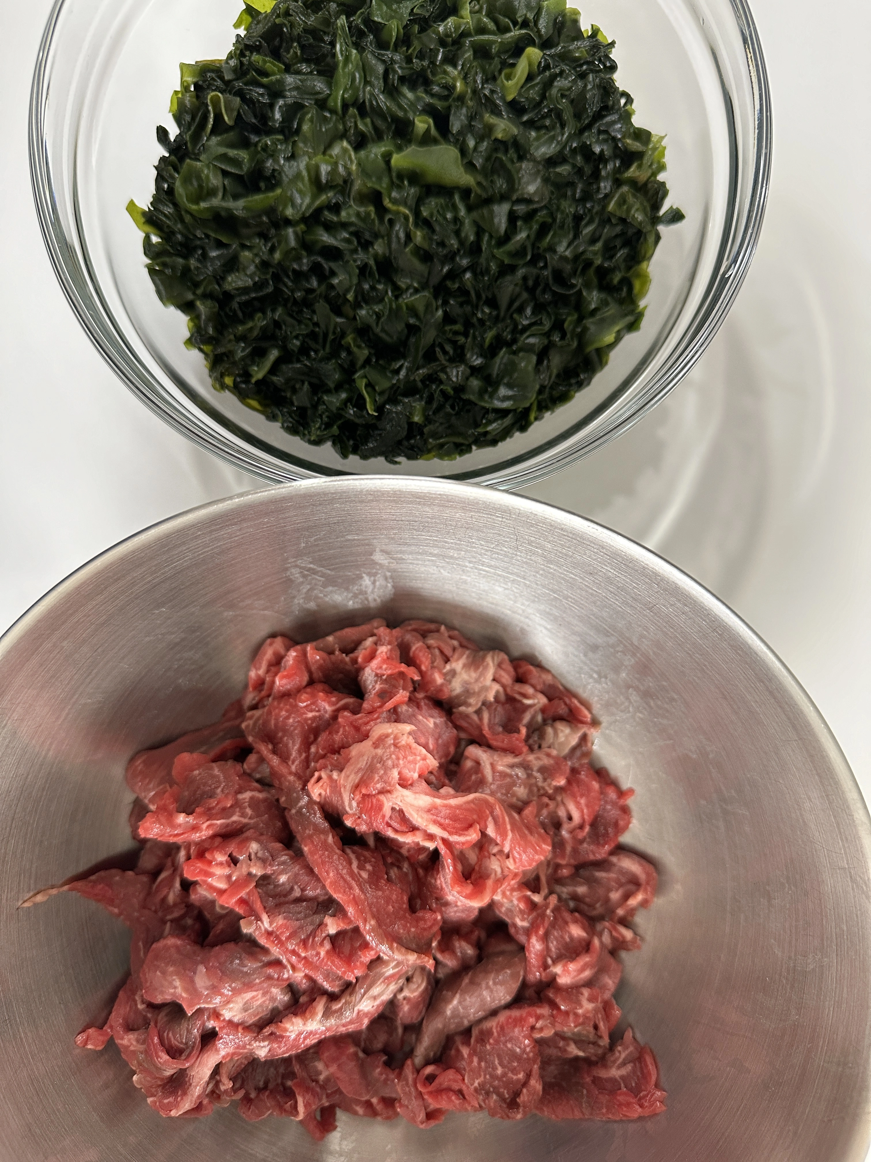 소고기는 핏물을 뺄 수 있도록 키친타올로 톡톡 두드려서 준비해주세요. 미역국을 끓일 때 국거리용 고기를 많이 쓰지만, 불고기용 고기를 사용하면 색다른 맛을 낼 수 있습니다.